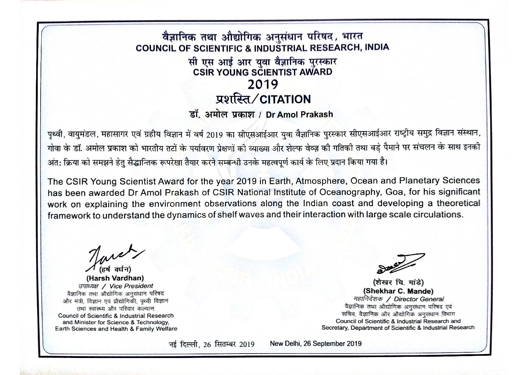 The CSIR Young Scientist Award for the year 2019 in Earth, Atmosphere, Ocean, and Planetary Sciences has been awarded to Dr Amol Prakash of CSIR-NIO, Regional Centre, Visakhapatnam for his significant work on the observed circulation along the Indian coast and his theoretical work on the dynamics of shelf waves and the impact of physical processes on the marine ecosystem.