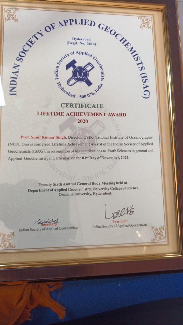 Prof. Sunil Kumar Singh, Director, CSIR-National Institute of Oceanography, (NIO), Goa has been conferred the Lifetime Achievement Award of the Indian Society of Applied Geochemists (ISAG), in recognition of his contributions to Earth Sciences in general and applied Geochemistry in particular.