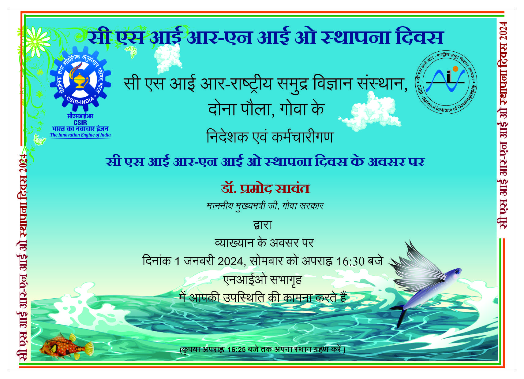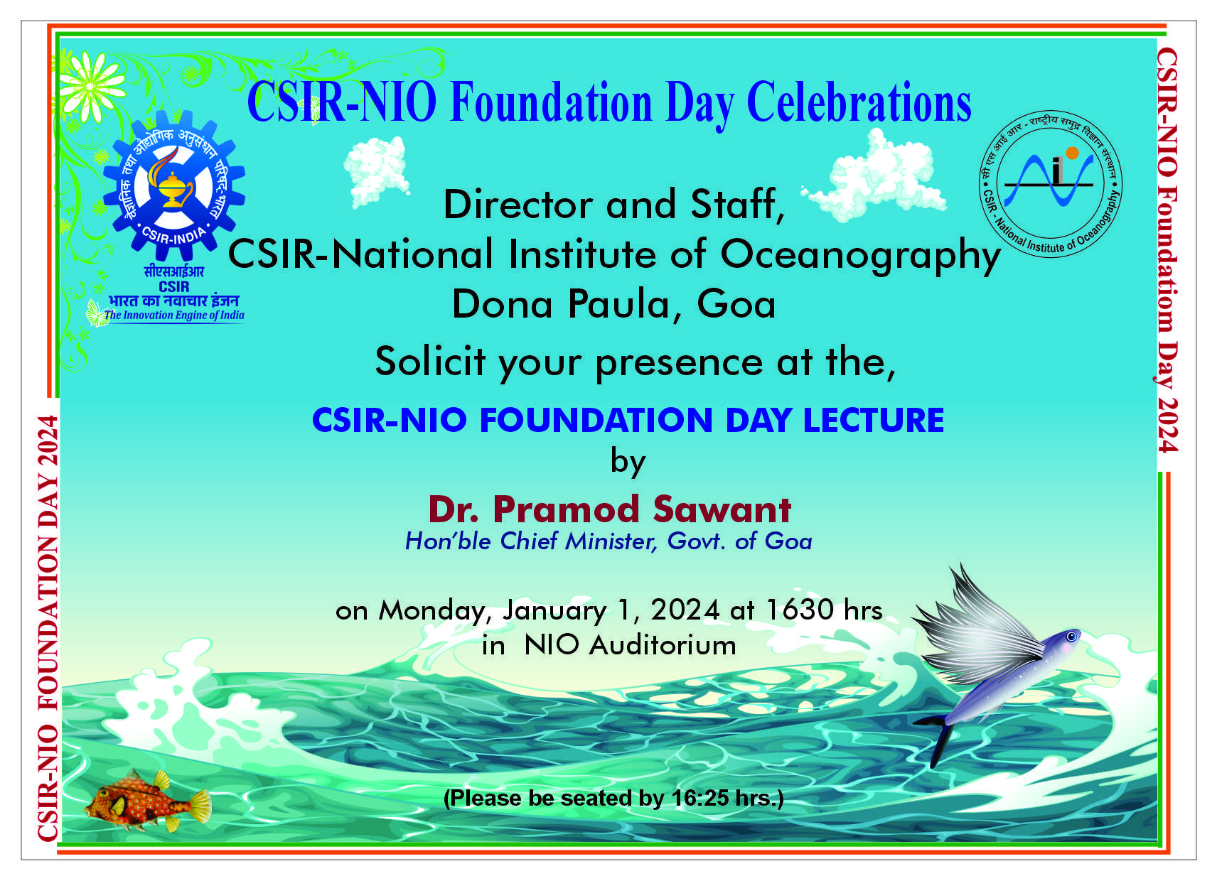 CSIR-National Institute of Oceanography (NIO), Dona Paula will be celebrating its Foundation Day, on Monday, 1st January 2024. On this occasion, the institute will remain open for the public from 9.00 am to 11.30 am. The visitors are welcome to visit the institute and view the exhibits of instruments used for oceanographic research, as well as view films on ocean science and a talk on “Career in Oceanography”. Later in the afternoon CSIR-NIO Foundation day lecture will be delivered by the Chief Guest the Hon'ble Chief Minister of Goa, Dr. Pramod Sawant on “Oceanography and Society” at 16:30 hrs at NIO Auditorium, Dona Paula, Goa.
