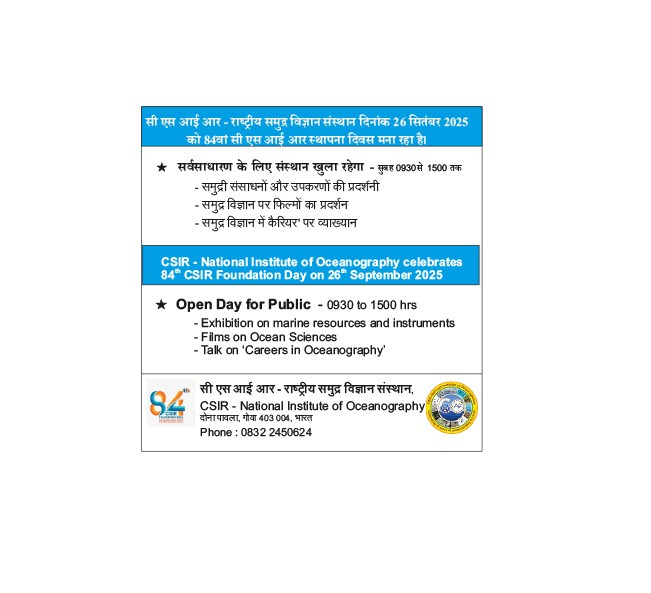 CSIR-National Institute of Oceanography will be hosting an open day on 26th September as part of the 84th Foundation Day celebration of the Council of Scientific and Industrial Research (CSIR). The CSIR's mission is to enhance the quality of life in India by developing innovative, competitive, and sustainable solutions through scientific research and technological development, fulfilling the goals of Atmanirbhar Bharat. On this occasion, the students are invited to participate in the exhibition on marine resources and instruments, where the scientific endeavours in ocean research will be exhibited, several films will be screened related to ocean sciences and a talk on 'Careers in Oceanography' will also be conducted. CSIR-NIO invites one and all to attend the CSIR foundation day Open Day program, which will be held on 26th September 2025 from 9.30 am to 3.00 pm at the CSIR-NIO, Dona Paula campus.