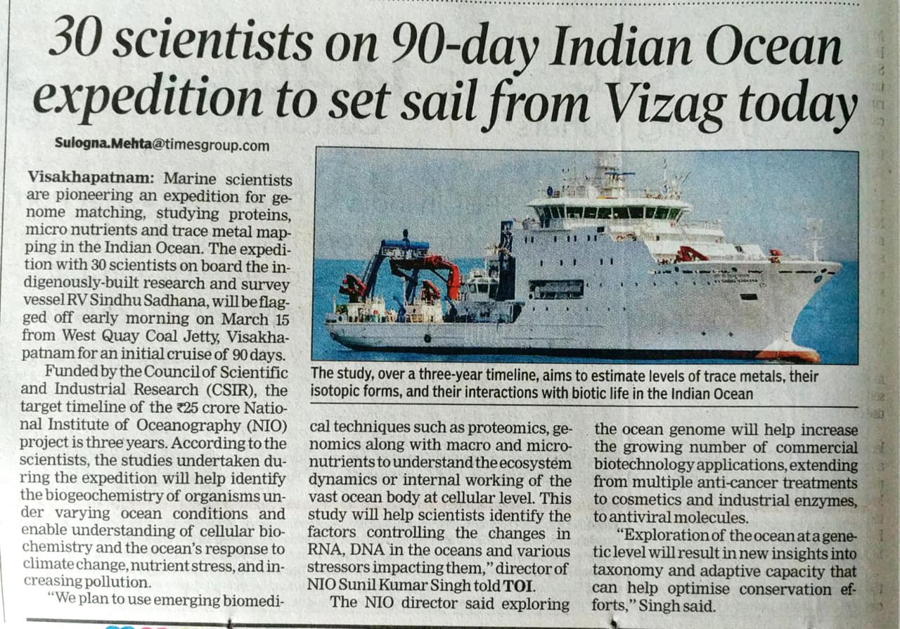 The research vessel Sindhu Sadhana, flagged off from the Visakhapatnam coast in Andhra Pradesh, will cover a distance of nearly 10,000 nautical miles trying to identify and characterise genes and proteins from marine life. The researchers will also explore the macro- and micro-nutrients in the waters to understand cellular level operations of ocean organisms, NIO Director Sunil Kumar Singh told Nature India.