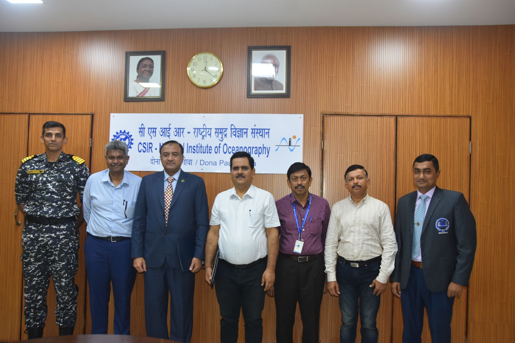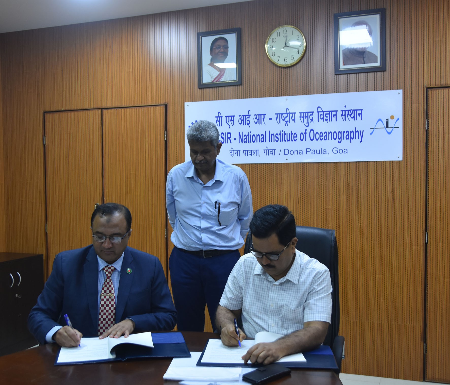 CSIR-National Institute of Oceanography, Goa, India (CSIR-NIO) and Bangabandhu Sheikh Mujibur Rahman Maritime University, Dhaka, Bangladesh (BSMRMU) signed a Memorandum of Understanding (MoU) on Scientific Cooperation in Ocean Sciences. The MoU effective for a period of five years was signed on 07th July, 2022, by Prof. Sunil Kumar Singh, Director, CSIR-NIO and Rear Admiral Mohammad Musa, OSP, NPP, rcds, afwc, psc, PhD, Vice-Chancellor, BSMRMU. The MoU is the outcome of the joint coordinated efforts from Captain SM Moyeen Uddin, Dean, Faculty of Earth and Ocean Science (BSMRMU), Captain Jayant Mahadik, Naval Advisor, High Commission of India, Dhaka, Sh. Venkat Krishnamurthy, in-charge, Collaborations Desk (CSIR-NIO), Dr. Narsinh L. Thakur, Head, International S&T Affairs Group (CSIR-NIO) and Dr. Mamta Sharma, Principal Scientist, International S&T Affairs Directorate, CSIR Headquarters.